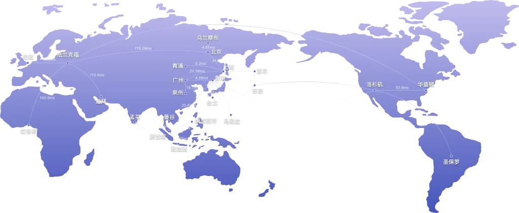 覆盖全球 100+ 国家及地区,200+PoP 节点,配备 SD-WAN 主备专线链路,以灵活多样化的部署方式,助力您在全球各地迅速开展业务,轻松实现网络延迟最优化,效率最大化。
