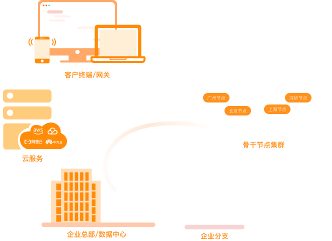 支持移动端/电脑端/服务器多终端稳定接入,实现国内/国外/总部/分支/办公室/移动场景安全快速组网。