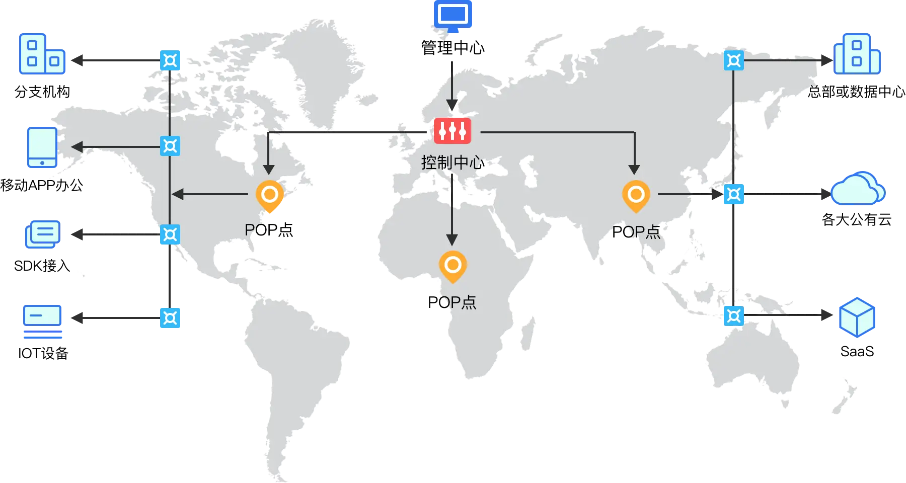 基于 SD-WAN 组网技术架构,提供海量全球接入节点及海量设备的接入与管理能力,实现全球节点互联、海外应用加速,广泛应用于 SaaS 加速、数据传输、远程控制等各种应用场景中,快速构建完整的全球网络解决方案